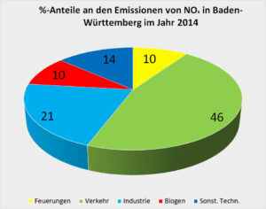 Aus dieser Grafik geht eindeutig hervor, dass der Anteil des Straßenverkehrs bei lediglich 13 % liegt, während Industrie und Haushalte mit 56 % den weitaus größten Anteil haben. Die sekundäre Rolle des Verkehrs zeigt sich auch an den Daten des Luftschadstoff-Emissionskatasters Baden-Württembergs für das Jahr 2014 [LUKA], Bild 3.