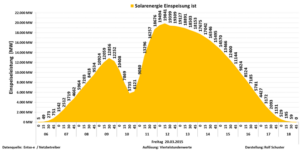Vergleicht man die Solareinspeisung im Kontext mit der Netzlast des Tages, zeigt die braune Fläche (Bild 2), dass diese Schwankung der Solarenergie, locker von den fossilen und Kernkraftwerken kompensiert wurde. Die Windenergie stellt für diesen Zeitraum im Prinzip einen Totalausfall der ca. 25000 Windkraftanlagen dar.