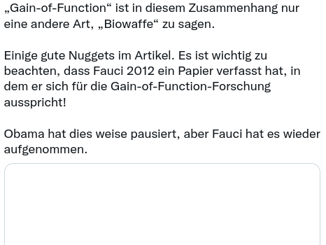 „Gain-of-Function“ ist in diesem Zusammenhang nur eine andere Art, „Biowaffe“ zu sagen.“ „Es ist wichtig zu beachten, dass Fauci 2012 […]