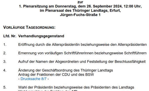 Die erste Sitzung des neuen Thüringer Landtags wurde von CDU- und BSW-Abgeordneten mehrfach unterbrochen. Schließlich wurde die Konstituierung auf Samstag […]