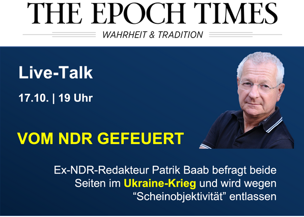 | LIVE-TALK | 17.10. | 19 Uhr EPOCH TIMES Live-Talk mit Ex-NDR-Redakteur Patrik Baab über seine kontroversen Ukraine-Reisen + Q&A |