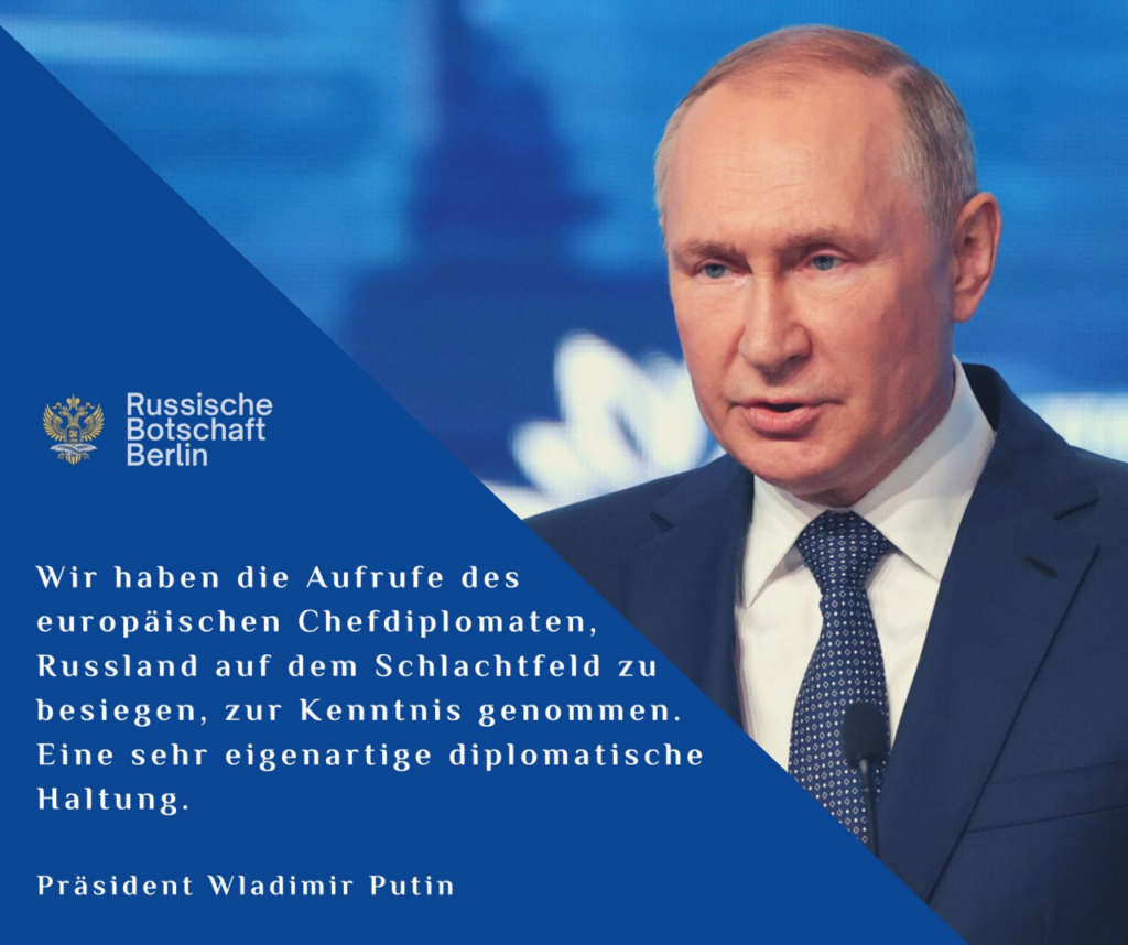 Das Östliche Wirtschaftsforum in Wladiwostok 2022 bot Präsident Wladimir Putin die Gelegenheit, die Welt über „eine sehr eigenartige diplomatische Haltung“, wie er sagte, zu informieren. Putin erklärte: „Wir haben die Aufrufe des europäischen Chefdiplomaten, Russland auf dem Schlachtfeld zu besiegen, zur Kenntnis genommen.“ Wäre er Verteidigungsminister eines Landes, wäre so eine Rhetorik verständlich, „aber so etwas aus dem Munde des Hauptdiplomaten der EU zu hören ist seltsam“.