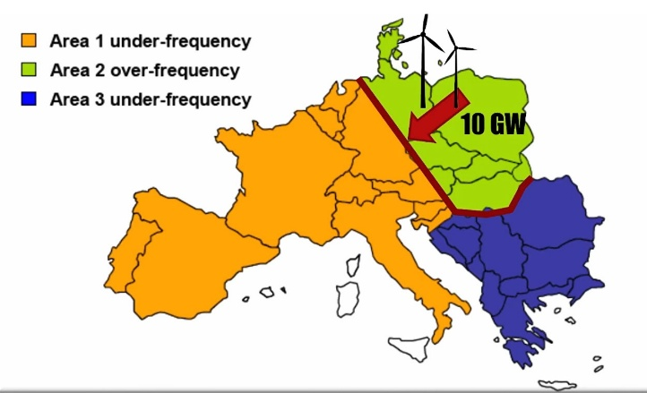 Beim Blackout im Jahr 2006 dauerte es nur 14 Sekunden, bis der Zusammenbruch besiegelt war und das europäische Stromnetz in drei getrennte Netzzonen zerfallen war, Bild 2.