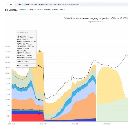 Diesen Kampf haben sie letztlich auch deshalb verloren, weil es noch weitere Schwachstellen wie die offenkundig unterdimensionierten „Not-Auslässe“ nach Frankreich gab, die dann vermutlich irgendwann dem ganzen instabilen Geschehen sozusagen den Stecker gezogen haben. Bei 60 % „Erneuerbaren“ im Netz wurde in Spanien offenkundig der Punkt erreicht, wo die Systemstabilität nicht mehr abgesichert werden konnte. In unseren Medien und seitens politischer Funktionäre wie dem Grünen Klaus Müller von der Bundesnetzagentur wird natürlich derzeit alles versucht, um dieses Ereignis zu verharmlosen und so zu tun, als ob so etwas bei uns nicht passieren könne.