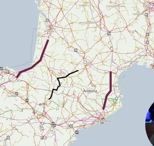 Bereits lange vor dem Zusammenbruch war nach Sonnenaufgang die chaotische Produktion aus „erneuerbarer“ Stromerzeugung hochgeschossen und danach immer weiter angestiegen, so dass die Gesamt-Stromproduktion den Bedarf (schwarze Linie mit der Bezeichnung „Last“) immer weiter überstieg. Schließlich lag der Anteil von Solar und Wind bei rund 60 %. Statt dies zu begrenzen, wurden die konventionellen Gas- und später auch die Kernkraftwerke heruntergefahren, während zugleich versucht wurde, den immer weiter zunehmenden Überschuss über drei Verbindungsleitungen nach Frankreich zu entsorgen. Diese Leitungen zeigt Bild 4.