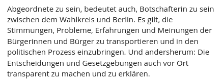„Egal ob Listenkandidat oder Gewinner eines Wahlkreismandats: Im Wahlkreis stehen die Abgeordneten den Bürgern Rede und Antwort. Regelmäßige Sprechstunden dienen dazu, die Probleme vor Ort zu kennen und die Interessen der Bürgerinnen und Bürger im Bundestag vertreten zu können“, behauptet die Bundeszentrale für politische Bildung (bpb).