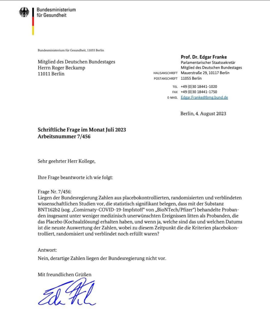 Die Antwort auf eine Anfrage von Prof. Dr. Edgar Franke an das Bundesministerium für Gesundheit (BMG) bestätigt die Kritiker der Impfpolitik. Die Werbung für die mRNA-Injektion gegen COVID-19 beruht nicht auf zuverlässigen Zahlen. Das Ministerium antwortete am 4. August 2023: