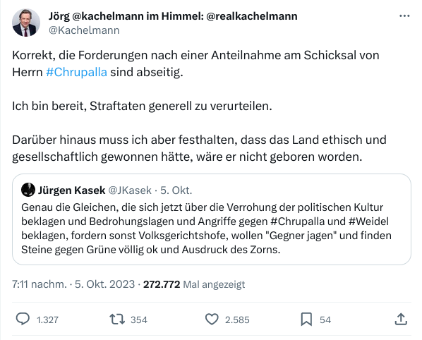 Zeitgenossen, darunter Bodo Ramelow (Linke), Ministerpräsident Thüringens, Jörg Kachelmann (kachelmannwetter) und Joachim Herrmann (CSU), Innenminister Bayerns, Maike Pfuderer (Grüne, „Wähl Herz statt Hetze“) wollten das Untersuchungsergebnis nicht abwarten und gewährten mit ihren hasserfüllten Stellungnahmen einen erschreckenden Einblick in ihre verkommene Moral.