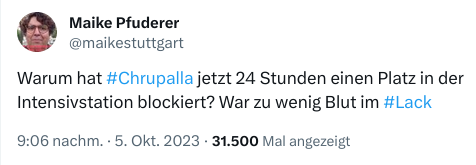 Und wieder einmal lernt die Welt etwas über die „westlichen Werte“ in Deutschland. Um 9:57 Uhr teilte Dieter Stein, Chefredakteur der Wochenzeitung „Junge Freiheit“, am 6. Oktober mit, dass dem Blatt exklusiv der Arztbericht mit Diagnose des Klinikums Ingolstadt vorliegt. Beim AfD-Vorsitzenden Tino Chrupalla sei ein Einstich diagnostiziert, die mutmaßlich injizierte Substanz sei unklar. Chrupalla war am 5. Oktober während einer Wahlveranstaltung zusammengebrochen und ins Krankenhais geliefert worden.
