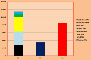 Die Schwankungsbreite des „Stotterstroms“ aus den „erneuerbaren“ Quellen ist bekanntlich enorm: Bei einer installierten Nominalkapazität von rund 75.000 MW lieferten beide Quellen zusammen im Jahre 2014 im Minimum gerade mal 29 MW (!), während sie im Maximum 38.000 MW ins Netz pumpten. Da die „Energiewende“ für die Zukunft vor allem auf Wind- und Solaranlagen nebst ein wenig Wasserkraft setzt, hat der inzwischen erfolgte massive Aufbau entsprechender Kapazitäten bereits jetzt dazu geführt, dass beim Zusammentreffen niedrigen Verbrauchs und hoher Einspeisung von „erneuerbar“ erzeugtem Strom erheblichen Überkapazitäten im Netz auftreten können, Bild 3.