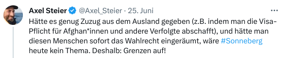Hass und Hetze von denen, die behaupten, sie würden genau gegen diese Hass und Hetze kämpfen, sei auf Twitter allgegenwärtig, sagt Boris Reitschuster. Dies sei eine „massive Selbstentlarvung“. Die Sonneberger Wähler werden als „Nazis“ beschimpft, und ein Boykott von Waren aus dem kleinen Landkreis gefordert. „Genau dieses Milieu hat heute die Macht. Leute wie Robert Habeck, die selbst als Vizekanzler im Bundestag bei der Nationalhymne demonstrativ nicht mitsingen. Und der nach eigenen Worten „Vaterlandsliebe stets zum Kotzen fand“ und mit „Deutschland nichts anzufangen weiß”. Kulturkämpfer wie Habeck und Flüchtlingsaktivist Steier sind die besten Wahlhelfer der AfD. Dabei sind die Tweets von Steier nur die Spitze des Eisberges.“