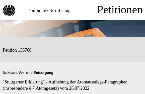 Mit der Petition „Stuttgarter Erklärung“ vom 25.07.2022 fordern 19 erstunterzeichnende aktive Professorinnen und Professoren deutscher Universitäten die sofortige Aufhebung der Atomausstiegs-Paragraphen (Insbesondere § 7 Atomgesetz) und eine Prüfung der sicherheitstechnischen Betriebserlaubnis, um deutschen Kernkraftwerken den Weiterbetrieb zu ermöglichen. Sie stützen ihre Argumente auf die sich verschärfende Energiekrise sowie die vom IPCC und der EU als CO2-arm und nachhaltig eingestufte Kernenergie.