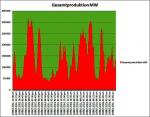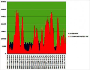 Um die konkreten Auswirkungen des beschlossenen Ausbaus von Wind- und Solarstromerzeugung im Jahre 2050 zu veranschaulichen, wurden die realen Zahlen der Stromproduktion des Dezembers 2013 in viertelstündlicher Auflösung zugrunde gelegt. Dann wurden sowohl die vollständige Netzlast als auch die zu erwartende Leistungsbereitstellung durch Wind- und Solarkraftwerke mit Hilfe der oben aufgeführten Zahlen umgerechnet. Bild 4 zeigt die entsprechenden Werte für die Netzlast (entspricht in etwa dem inländischen Verbrauch) sowie für die Summenleistung von Wind- und Solarenergieanlagen plus Wasserkraft. Der Spitzenwert liegt bei 296000 MW.
