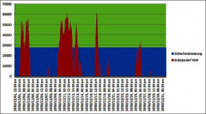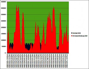 In der Spitze – d.h. bei günstigen Wetterverhältnissen und einer auf die Sicherheitsreserve reduzierten Leistung der konventionellen Kraftwerke – würden bis zu 319600 MW an elektrischer Leistung eingespeist – das ist um den Faktor 3,76 Mal mehr als die 85000 MW an gesicherter Leistung, für die unser Stromversorgungssystem einschließlich der Leitungsnetze