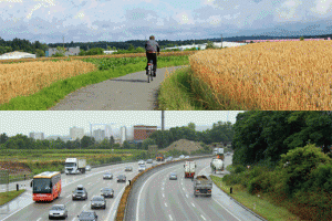 Das Problem ist dabei, dass man hierfür die Leitungsnetze entsprechend der im Extremfall zu erwartenden Strommengen überdimensionieren muss. Während für das bereits angesprochene 1-MW-Motorkraftwerk eine Leitung mit einer Transportkapazität von 1 MW völlig ausreichen würde, müsste sie für den Anschluss eines Windparks mit 5,75 MW auch für dessen Maximalkapazität ausgelegt werden, auch wenn im Jahresmittel nur 1 MW Transportkapazität genutzt wird. Anders ausgedrückt: Man muss eine 5,75 MW-Leitung vorsehen, die jedoch statt zu 98,5 % lediglich zu 17,4 % ausgelastet wird. Im Straßenbau entspräche dies dem Bau einer sechsspurigen Autobahn, über die dann im Mittel das Verkehrsaufkommen einer einspurigen Landstraße abgewickelt wird, Bild 3. Noch schlechter sieht es bei Solaranlagen aus, da hier das Verhältnis 1/12 ist. Das entspräche einer 12spurigen Autobahn statt einer Landstraße.