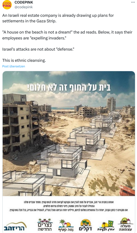 „Ein israelisches Immobilienunternehmen entwirft bereits Pläne für Siedlungen im Gazastreifen. „Ein Haus am Strand ist kein Traum!“ Die Anzeige lautet. Unten heißt es, dass ihre Mitarbeiter „Eindringlinge vertreiben“. Bei Israels Angriffen geht es nicht um „Verteidigung“. Das ist ethnische Säuberung.“ (Codepink, https://twitter.com/codepink/status/1736883716138393851)
