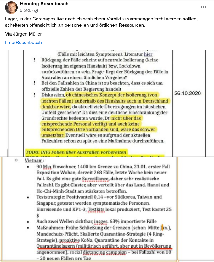 Die Veröffentlichung der RKI Protokolle gewährt nicht nur Einblicke in die Dominanz der Politik, die sich über Empfehlungen des Robert Koch-Instituts hinwegsetzt, sondern auch in Überlegungen des RKI, das sich nicht nur mit wissenschaftlicher Forschung begnügt. Die Einschränkung der Grundrechte scheitert aus der Sicht des RKI nicht an unveräußerlichen Rechten, sondern an mangelndem Personal und fehlenden Örtlichkeiten.