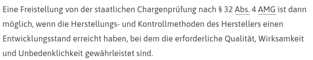 Vermerkt sei noch, dass das PEI die Überprüfung, die nach den Verfahren und Regelungen der amtlichen Arzneimittelkontrolllabore (OMCL) der Mitgliedstaaten der Europäischen Union (EU) bzw. des Europäischen Wirtschaftsraumes (EWR) oder der Schweiz erfolgt, als „experimentelle Prüfung und Freigabe der Chargen“ bezeichnet. Die Bezeichnung „experimentelle Prüfung“ wirft weitere Fragen auf.