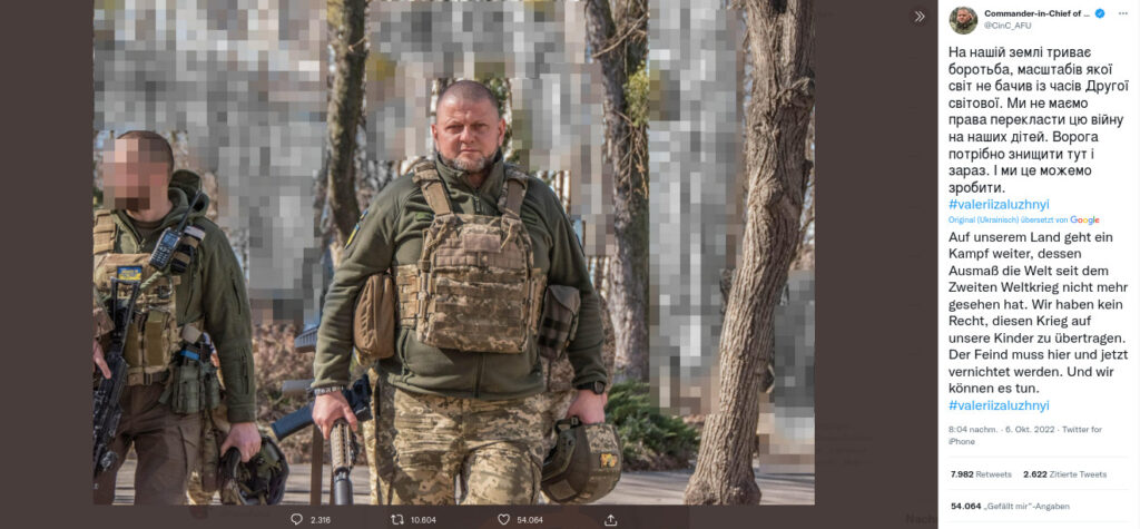 General Valerii Zaluzhnyi, Oberbefehlshaber der Streitkräfte der Ukraine, twittert am 6.Oktober 2022: „Auf unserem Land geht ein Kampf weiter, dessen Ausmaß die Welt seit dem Zweiten Weltkrieg nicht mehr gesehen hat. Wir haben kein Recht, diesen Krieg auf unsere Kinder zu übertragen. Der Feind muss hier und jetzt vernichtet werden. Und wir können es tun.“ (Übersetzung Twitter, https://twitter.com/CinC_AFU/status/1578083916296192000)