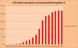 Bei der Einführung des Erneuerbare-Energien-Gesetzes (EEG) im Jahre 2000 wurde versprochen, dass die Kosten höchstens beim Gegenwert einer Kugel Eis im Monat liegen würden. Seitdem sind die Beträge, die den deutschen Solarkönigen und Windbaronen zugeflossen sind, auf jährlich mehr als 20 Mrd. € angestiegen, davon fast die Hälfte allein für Solarstrom. Kumuliert haben die deutschen Verbraucher bis Ende 2015 bereits mehr als 62 Mrd. € an die Besitzer von Fotovoltaikanlagen bezahlen dürfen. Doch das ist nur die halbe Story, denn mit jeder neu installierten Anlage wird der Verbraucher verpflichtet, auch für diese insgesamt 20 Jahre lang Zahlungen zu leisten. Entscheidend ist somit die Gesamtsumme aus bereits geleisteten Zahlungen und noch abzustotternden Verpflichtungen, die in Bild 2 gezeigt wird.