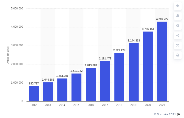 Die Statistik (Statista) zeigt den Pkw-Bestand im Segment SUVs in Deutschland in den Jahren 2012 bis 2021. Am 1. Januar 2021 waren in Deutschland rund 4,3 Millionen Personenkraftwagen aus dem SUV-Segment registriert.
