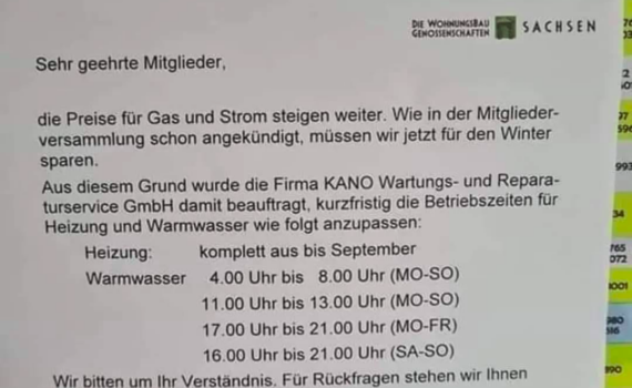 Die Wohnungsgenossenschaft in Dippoldiswalde reduziert ab sofort die Versorgung von Mietern mit Warmwasser, berichtet unter anderem die Zeitung aus Sachsen […]