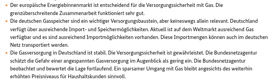 „Deutschland verfügt über ausreichende Import- und Speichermöglichkeiten. Aktuell ist auf dem Weltmarkt ausreichend Gas verfügbar und es sind ausreichend Importmöglichkeiten vorhanden.“